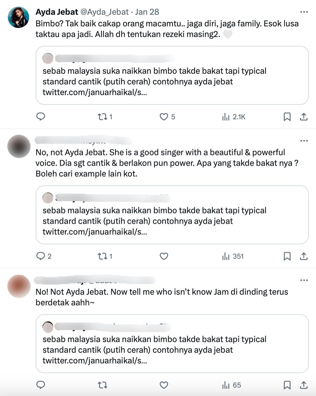 Menerusi satu hantaran di platform X yang membincangkan mengapakah Aisyah Aziz masih sukar membina nama, individu terbabit mendakwa Malaysia hanya mengangkat penyanyi bimbo tanpa bakat dan meletakkan nama Ayda Jebat sebagai contoh.
