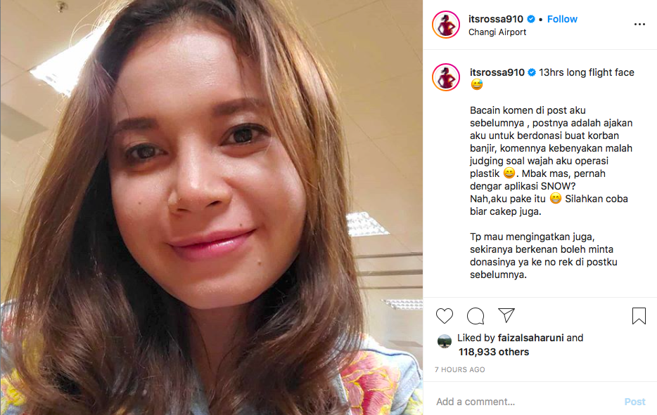 "Bacain komen di post aku sebelumnya, postnya adalah ajakan aku untuk berdonasi buat korban banjir, komennya kebenyakan malah judging soal wajah aku operasi plastik," tulis Rossa pada akun @itsrossa910, Jumat (10/1/2020).