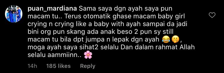 “Dia pakat dengan PA mintak kongsi lokasi dan jangan bagitahu dia nak datang. Terima kasih sangat-sangat my baby girl,” coretnya.