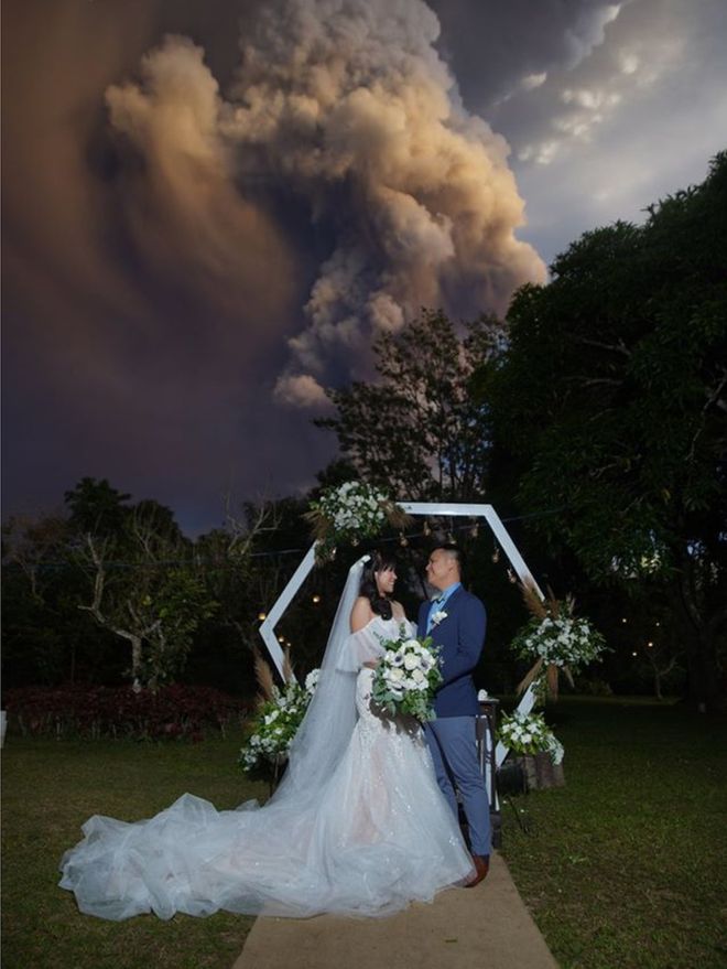 Momen pernikahan pasangan pengantin dari Filipina, Chino Vaflor dan Kat Bautista Paloma pada Minggu (12/1/2020) menjadi lebih sakral lantaran ia dihelat saat Gunung Taal erupsi.