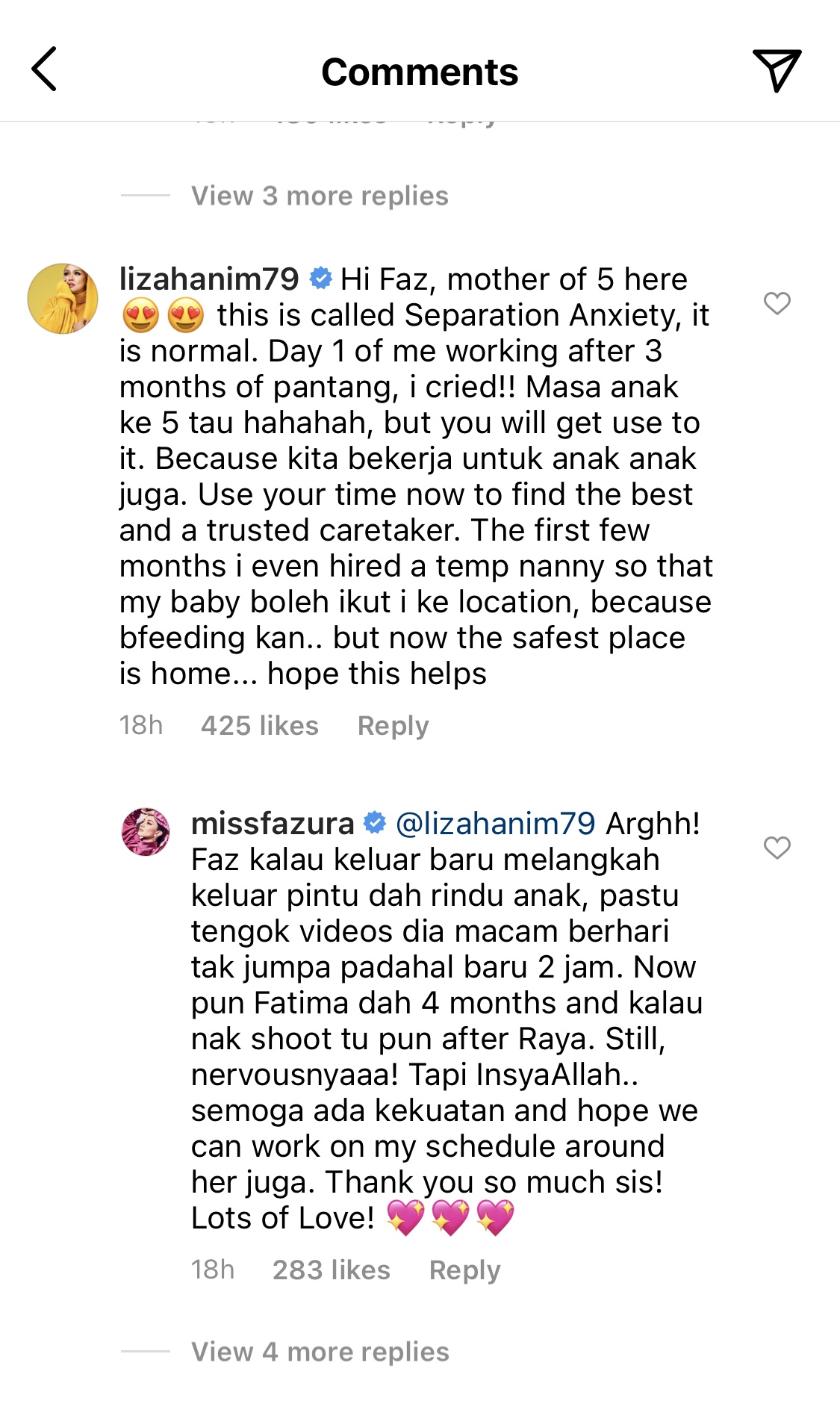 Penyanyi Liza Hanim juga tidak ketinggalan berkongsi tips, menurutnya, Fazura sedang mengalami perasaan takut untuk berpisah atau Separation Anxiety dan perkara itu pernah dialami Liza yang mempunyai lima orang cahaya mata.