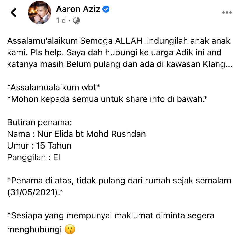Terdahulu, orang ramai termasuk Aaron menerusi satu hantaran di laman Facebook miliknya berkongsi maklumat mengenai gadis yang hilang itu bersama maklumat terperinci bagi membantu keluarganya mencari anak mereka.