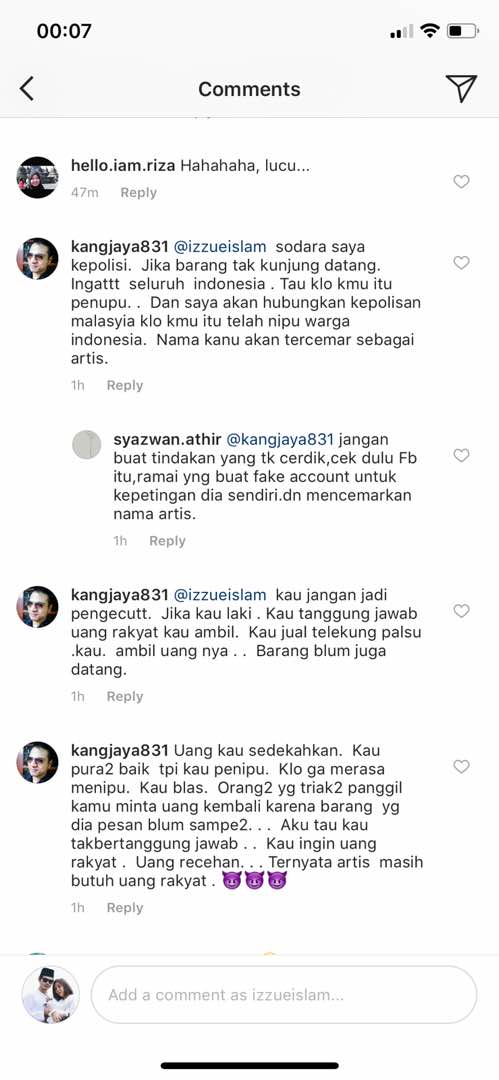 Izzue Islam berkata lebih mengejutkan lagi peminat itu semua berasal dari Indonesia dan mendakwa telah kerugian sehingga lebih 20 juta rupiah (RM6,000).