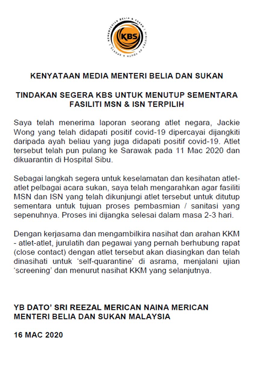“Sebagai langkah segera untuk keselamatan dan kesihatan atlet- atlet pelbagai acara sukan, saya mengarahkan agar fasiliti MSN dan ISN yang telah dikunjungi atlet itu untuk ditutup sementara untuk tujuan proses pembasmian / sanitasi yang sepenuhnya.