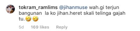 “Wah pergi terjun bangunan la kau Jihan. Heret sekali telinga gajah tu,” komennya yang turut disertakan dengan emoji ketawa.