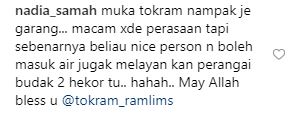 Ternyata komen itu mendapat perhatian pengikutnya dan rata-ratanya terhibur dengan Jihan dan Nabil yang disifatkan sebagai anak manja Tok Ram.
