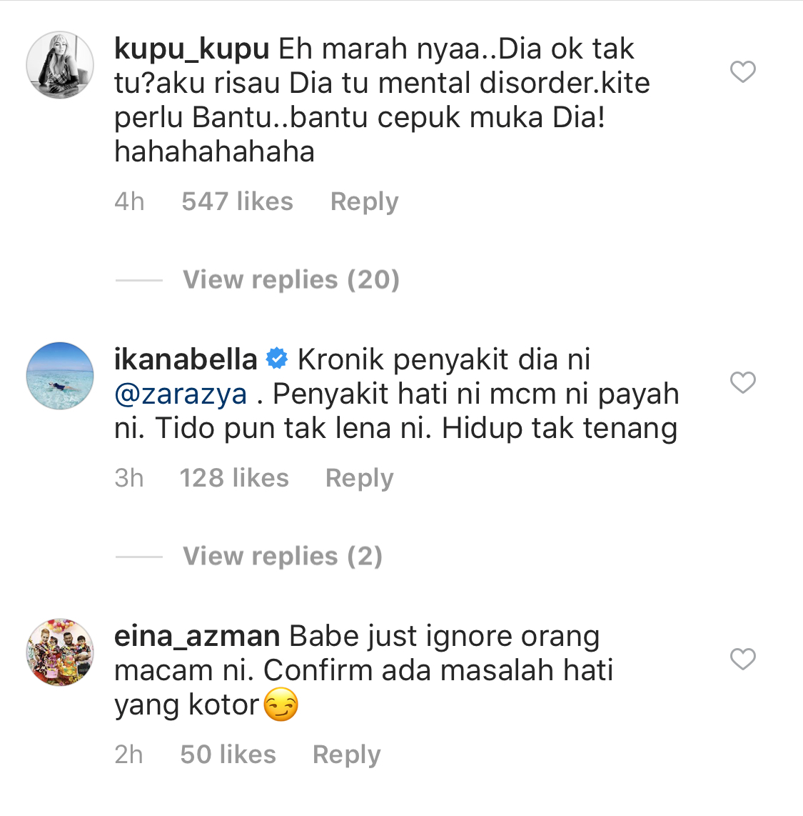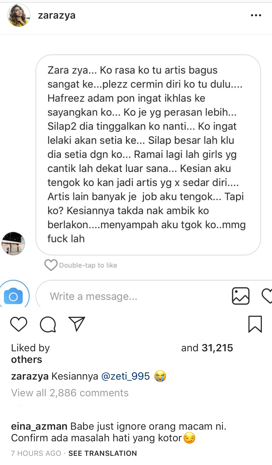 Zara mendedahkan kecaman yang diterima menerusi salah sebuah entri terbaru di laman Instagram miliknya.