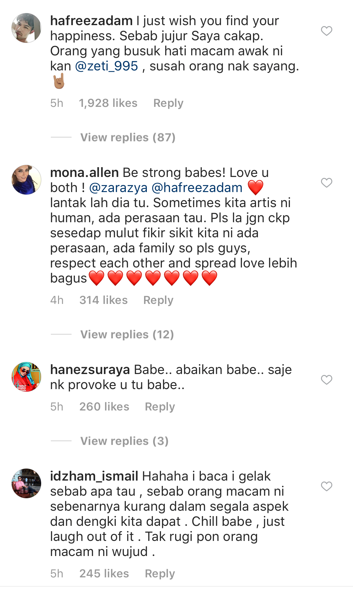 Di ruangan komen, Hafreez bersama rakan-rakan artis lain seperti Mona Allen, Hanez Suraya, Idzham Ismail, Nabila Huda, Ika Nabella dan Eina Azman turut mengecam tindakan @zeti_995.