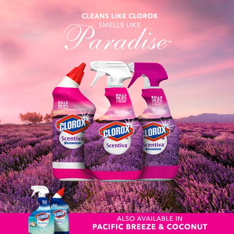 Clorox Scentiva Tuscan Lavender boleh didapati dalam bentuk gell pencuci tandas, buih pembersih nyahkuman dan pencuci pelbagai permukaan.