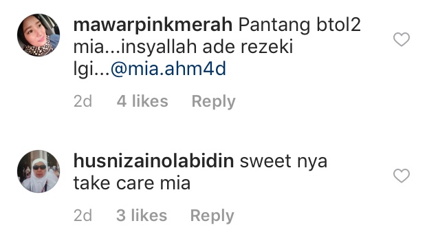 Selepas mendedahkan berita keguguran tersebut, Mia menerusi akaun Instagram (IG)nya menerima banyak kata-kata semangat supaya jangan terlalu bersedih dengan apa yang berlaku.