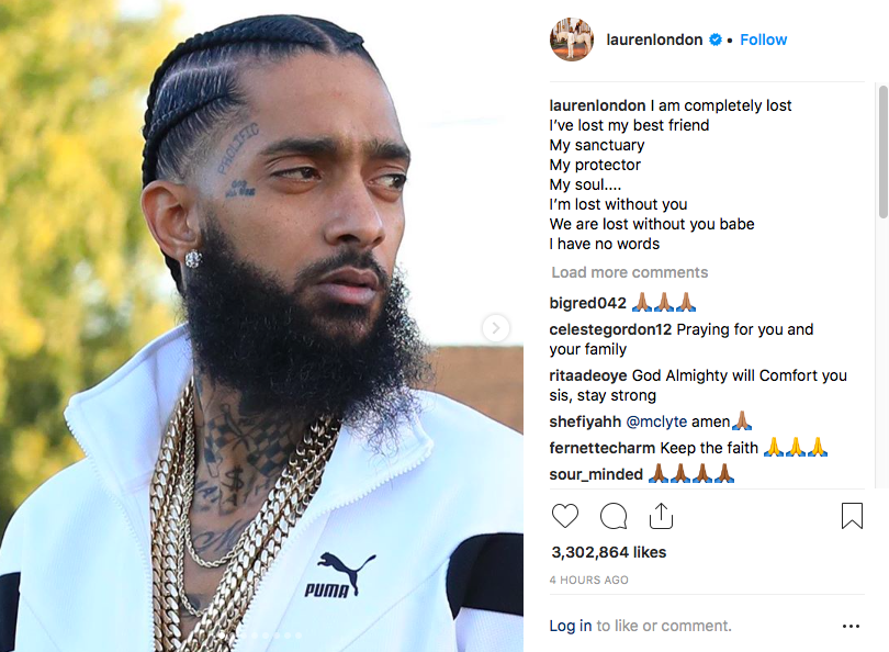 Wanita itu juga mengungkapkan dirinya telah kehilangan separuh jiwa, pelindung dan seorang sahabat sejati setelah Hussle mati karena ditembak oleh orang yang tidak dikenali.
