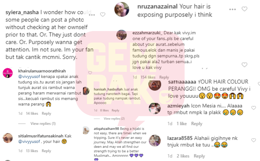 "Dear kak vivy, saya salah seorang peminat awak, tolong berhati-hati mengenai aurat anda. Sebelum popular, elok dan manis je pakai tudung dengan sempurna. Tapi sekarang..tolong jangan pakai ala-ala turban semua, I love you Kak Vivy," tulis sebahagian netizen.