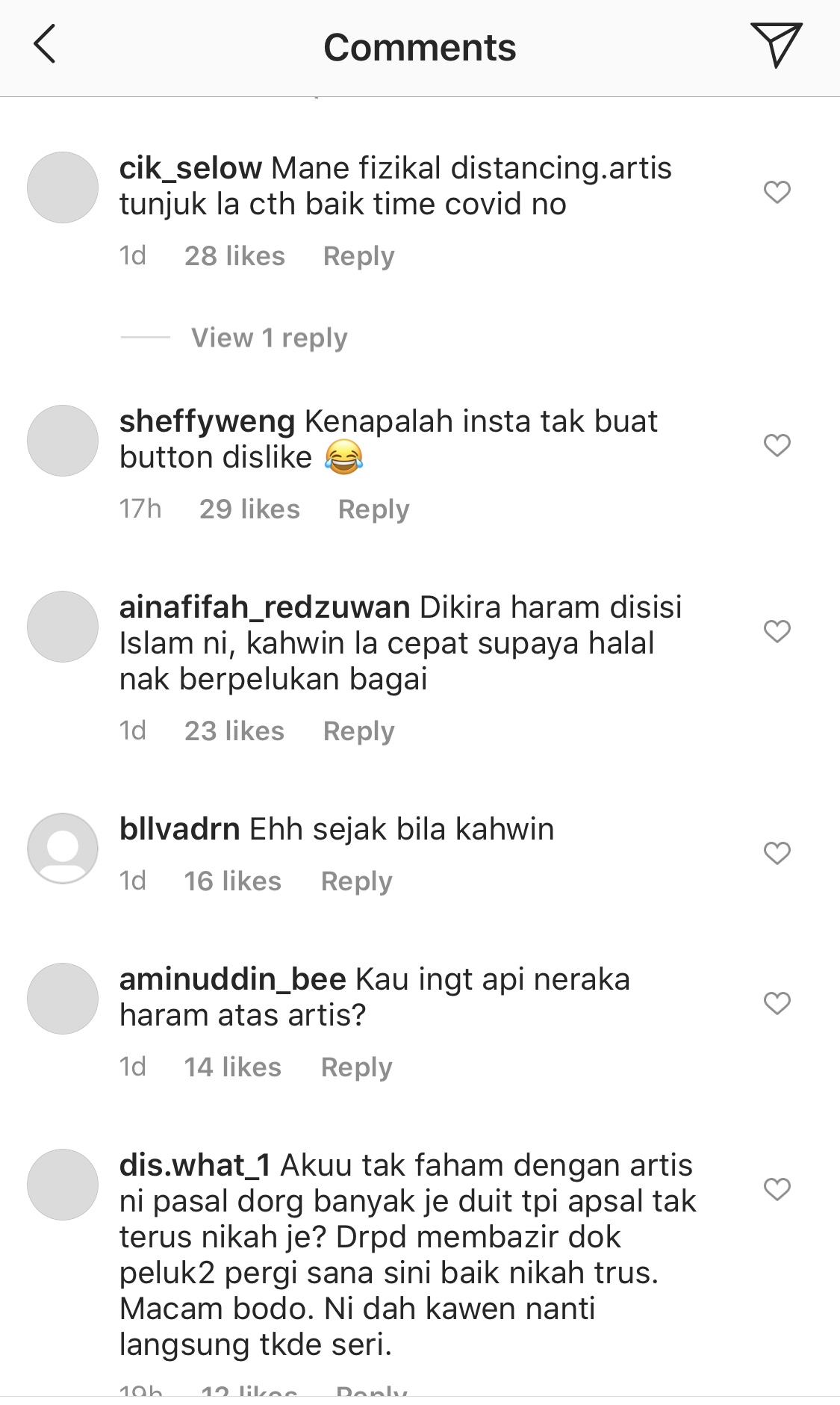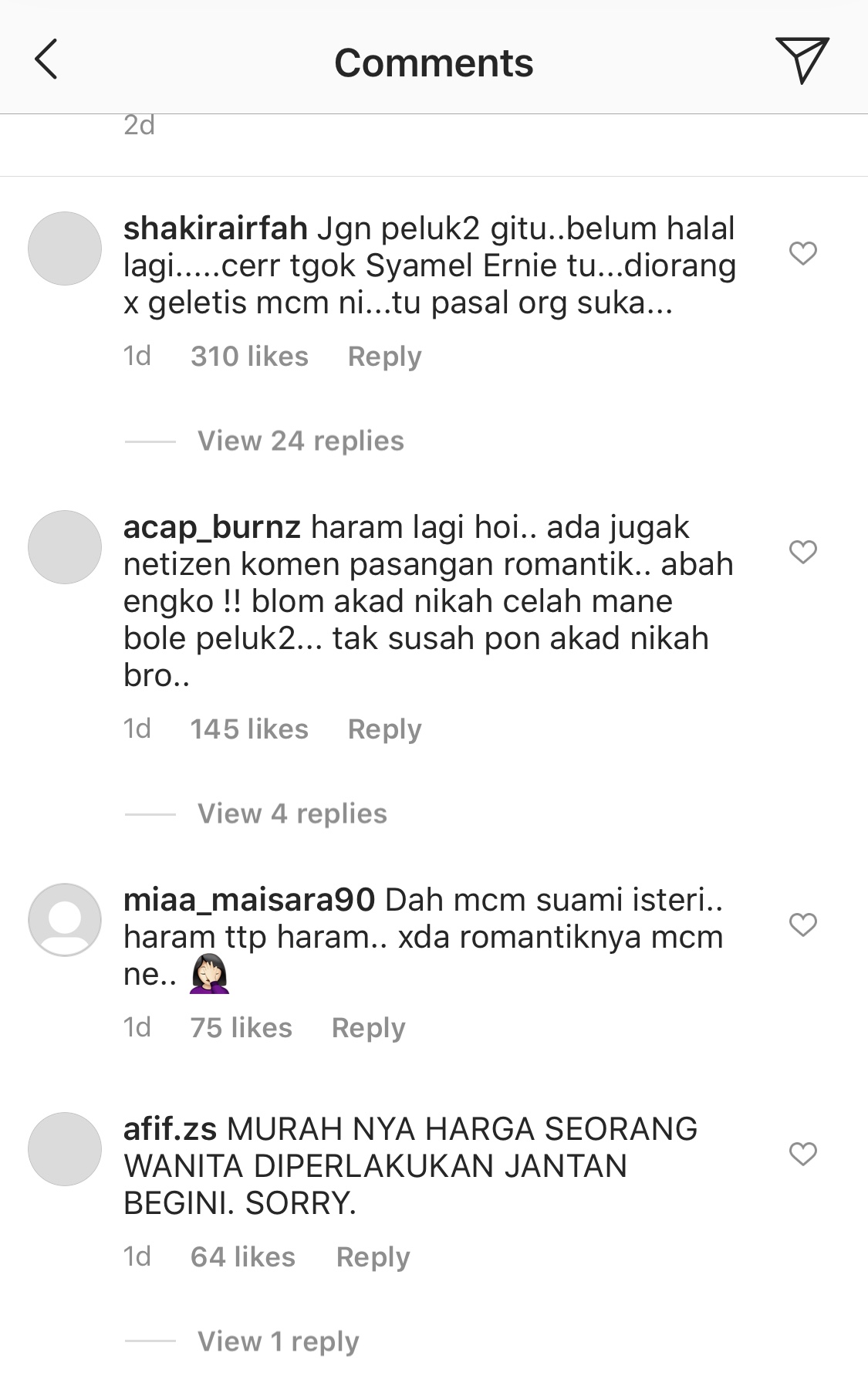 Menjengah ruangan komen, lain pula jadinya apabila terdapat segelintir wargamaya yang mengkritik tindakan Nabil dan Ayda berpelukan dalam foto yang dikongsi itu.