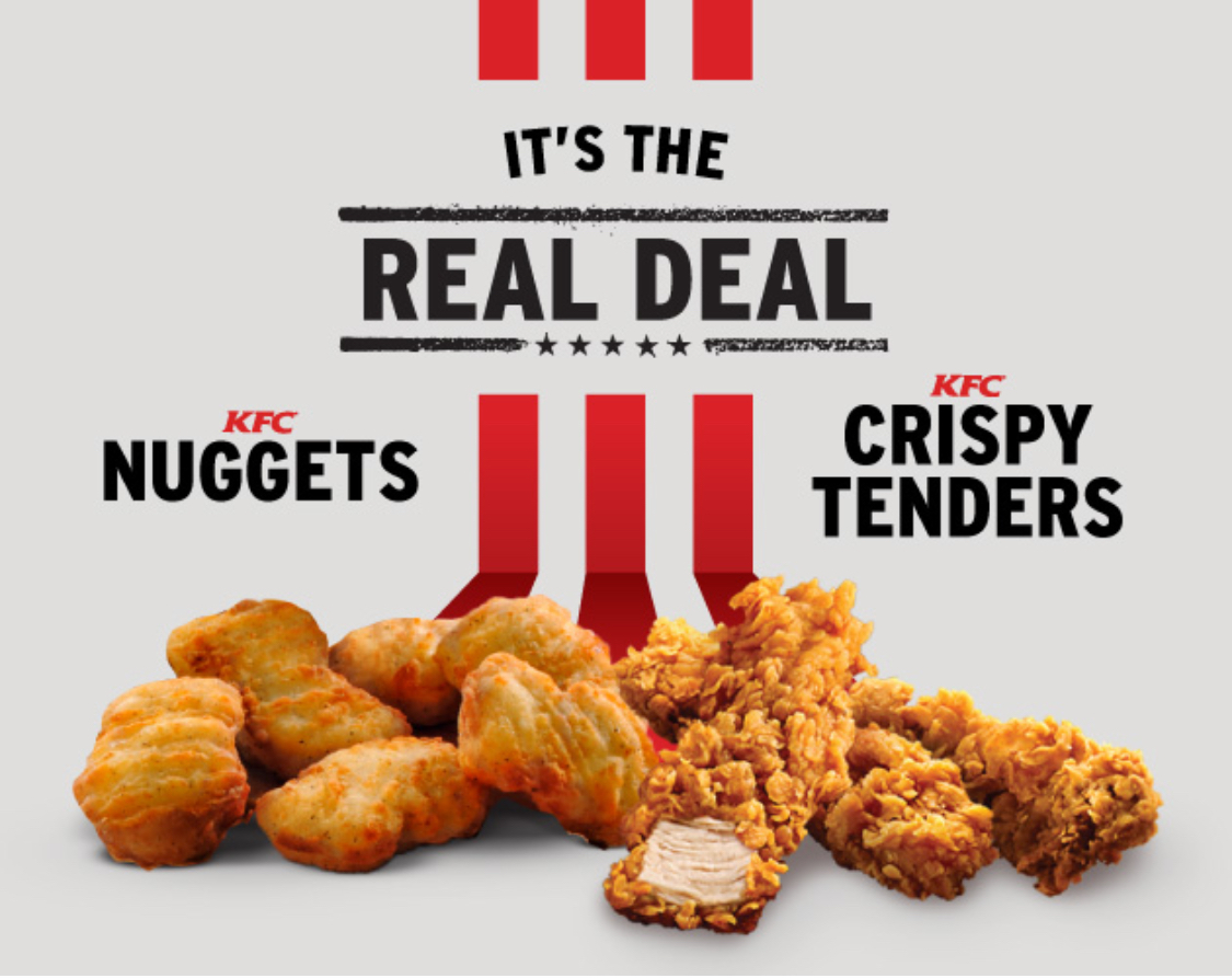 Dua KFC Real Deal ini adalah KFC Crispy Tenders yang merupakan daging ayam empuk dan lazat dengan resepi Hot & Spicy, dan juga KFC Nuggets yang merupakan Original Recipe dengan 11 herba dan rempah ratus.