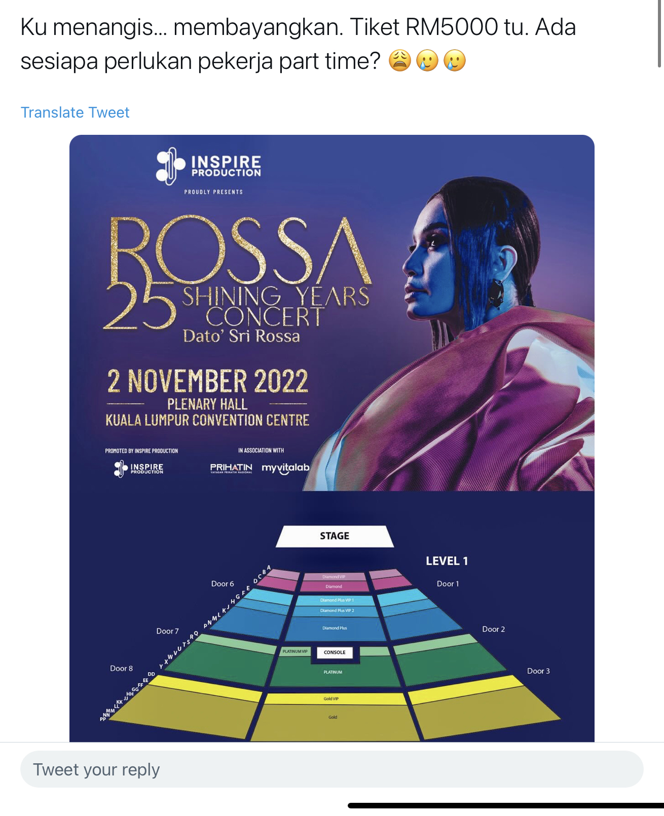 “Ku menangis… membayangkan. Tiket RM5,000 tu. Ada sesiapa perlukan pekerja part time?” Demikian antara ciapan pengguna di Twitter mengeluh tentang harga tiket konsert penyanyi diva Indonesia, Datuk Rossa yang akan berlangsung di Kuala Lumpur pada November ini.
