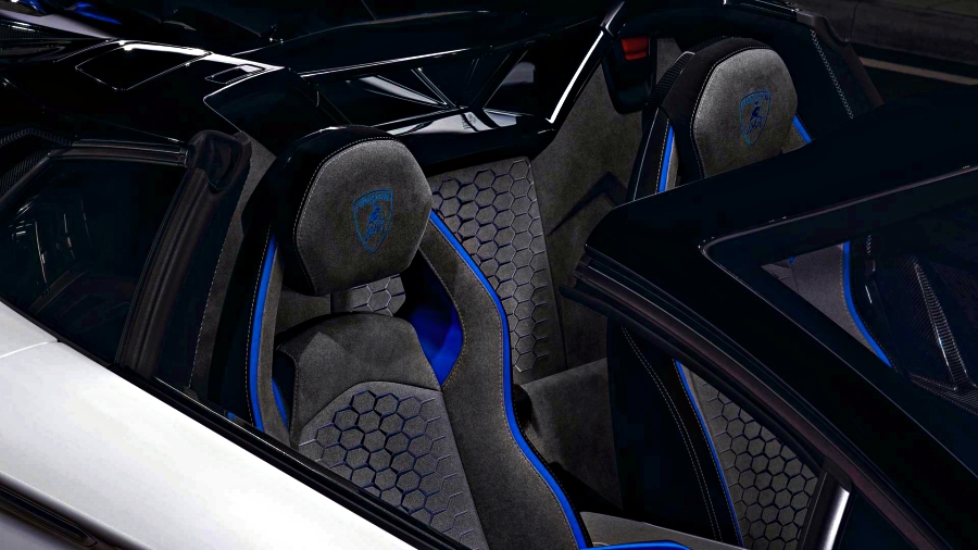 Untuk Aventador SVJ Xago Edition, bentuk itu boleh didapati pada bahagian badan dalam corak berwarna perak pudar serta pada keseluruhan tempat duduk.