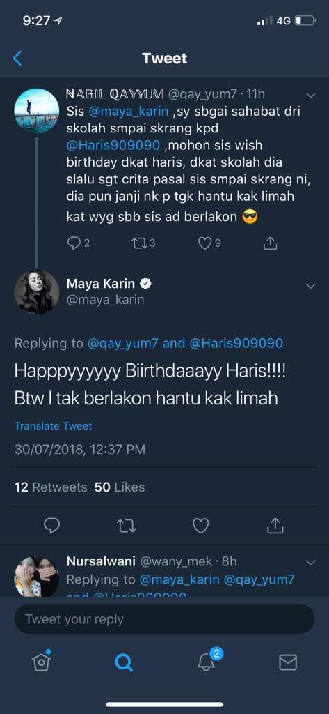 "Sis Maya Karin, saya sebagai sahabat dari sekolah sampai sekarang kepada @Haris909090, mohon sis wish birthday kat Haris.