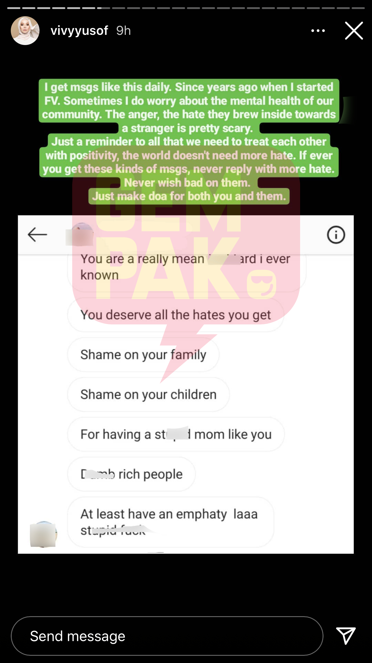 "You are a really mean f**ktard I ever know," demikian paparan skrin mesej yang dikirimkan pengguna di media sosial Instagram kepada usahawan terkenal Datin Vivy Yusof.