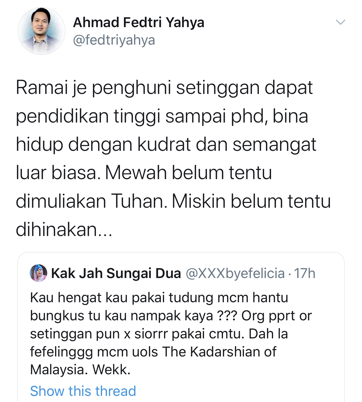 "Ramai je penghuni setinggan dapat pendidikan tinggi sampai PhD, bina hidup dengan kudrat dan semangat luar biasa. Mewah belum tentu dimuliakan Tuhan, miskin belum tentu dihinakan," tulis pengacara popular Fedtri Yahya.