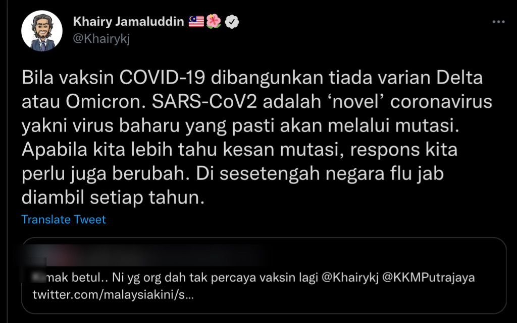 Menteri Kesihatan Khairy Jamaluddin membalas ciapan seorang netizen yang ‘naik hantu’ mengenai isu berkaitan pemberian dos penggalak keempat.