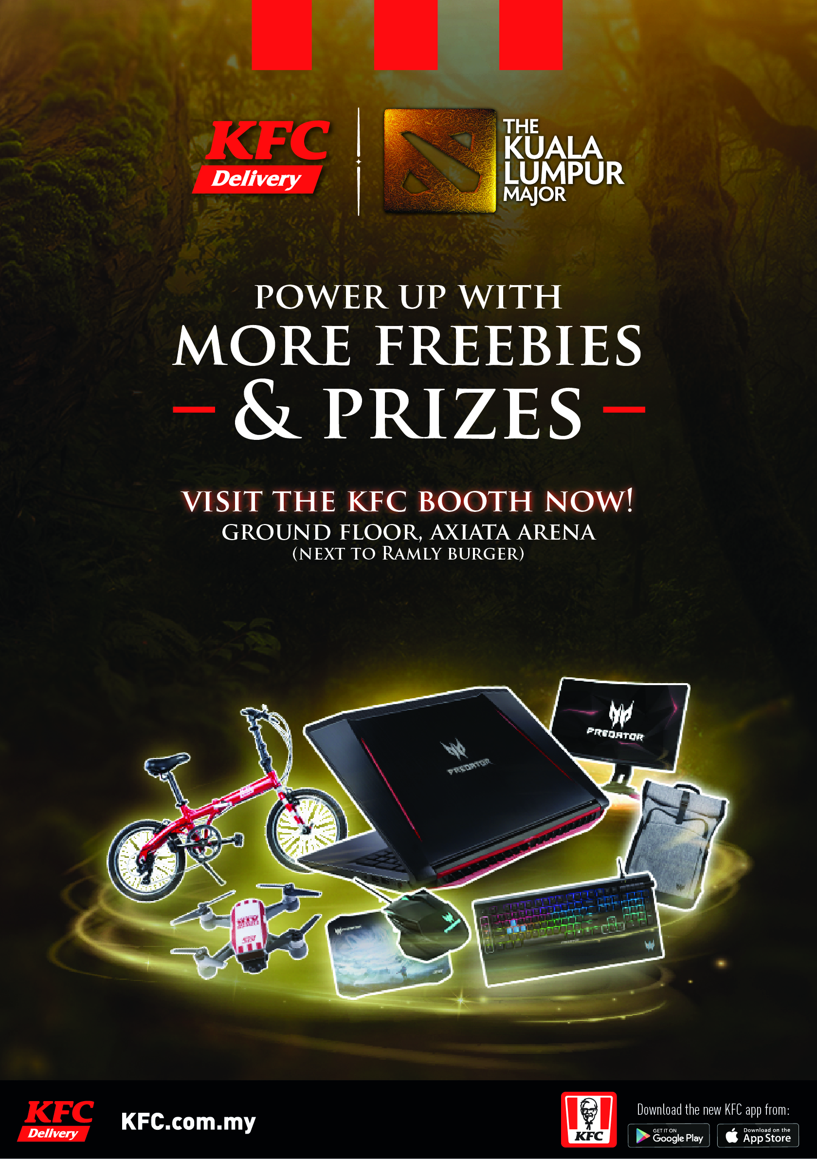 Dan jika anda akan menyaksikan pemain-pemain Dota 2 terbaik dunia di The Kuala Lumpur Major pada 16 hingga 18 November ini di Axiata Arena, jangan lupa ke booth KFC untuk peluang memenangi pelbagai hadiah dan mendapatkan barangan percuma. Tertakluk kepada terma dan syarat.