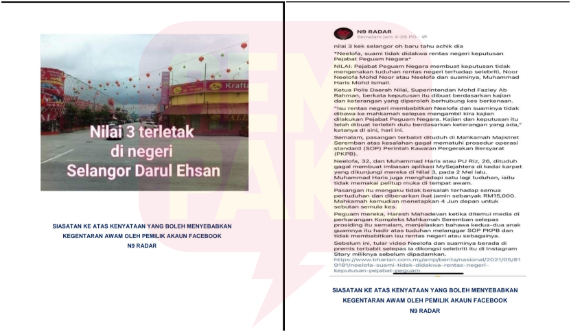 Terdahulu, pemilik akaun N9 Radar telah menyalin tampal berita melibatkan selebriti Neelofa dan suaminya Pu Haris yang tidak akan dikenakan tuduhan rentas negeri seperti yang diputuskan Pejabat Peguam Negara.