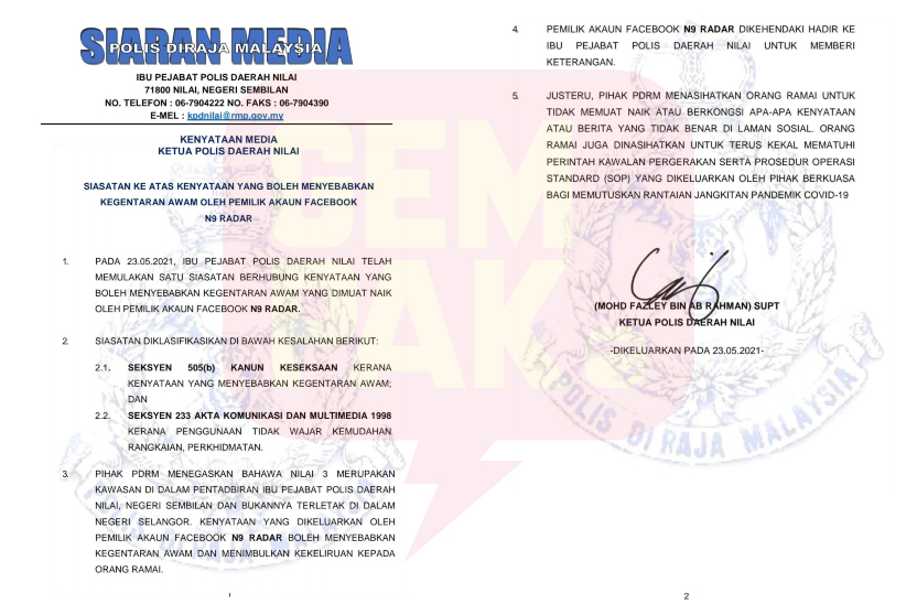 "Kenyataan yang dikeluarkan dalam Facebook N9 Radar boleh menyebabkan kegentaran awam dan menimbulkan kekeliruan kepada orang ramai," katanya dalam sebuah kenyataan pada Ahad.