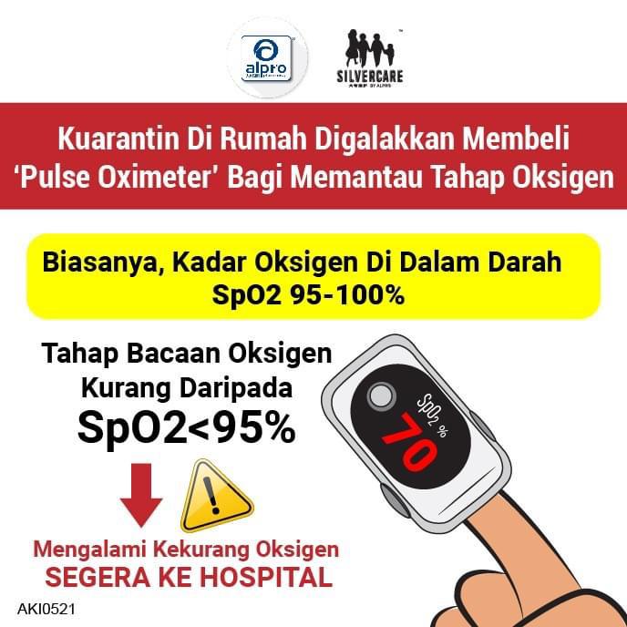 “Bagi pesakit Covid-19 yang dikuarantin dirumah, kalian digalakkan membeli Pulse Oximeter(gambar) untuk memantau tahap oksigen mereka dan segeralah ke hospital jika tahap bacaan oksigen kurang daripada 95 peratus.