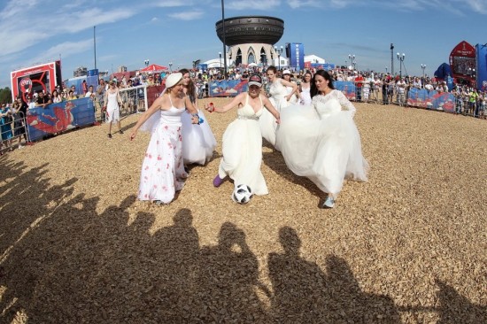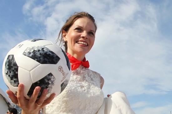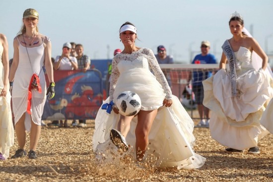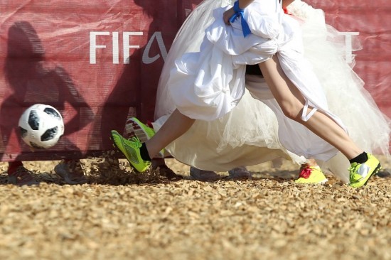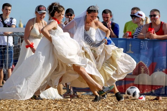 Bermain bola sepak dengan berpakaian gaun pengantin lengkap, sekumpulan wanita mencuri perhatian ramai apabila menyertai perlawanan persahabatan pada Sabtu lalu di bandar tuan rumah Piala Dunia, Kazan, Rusia.
