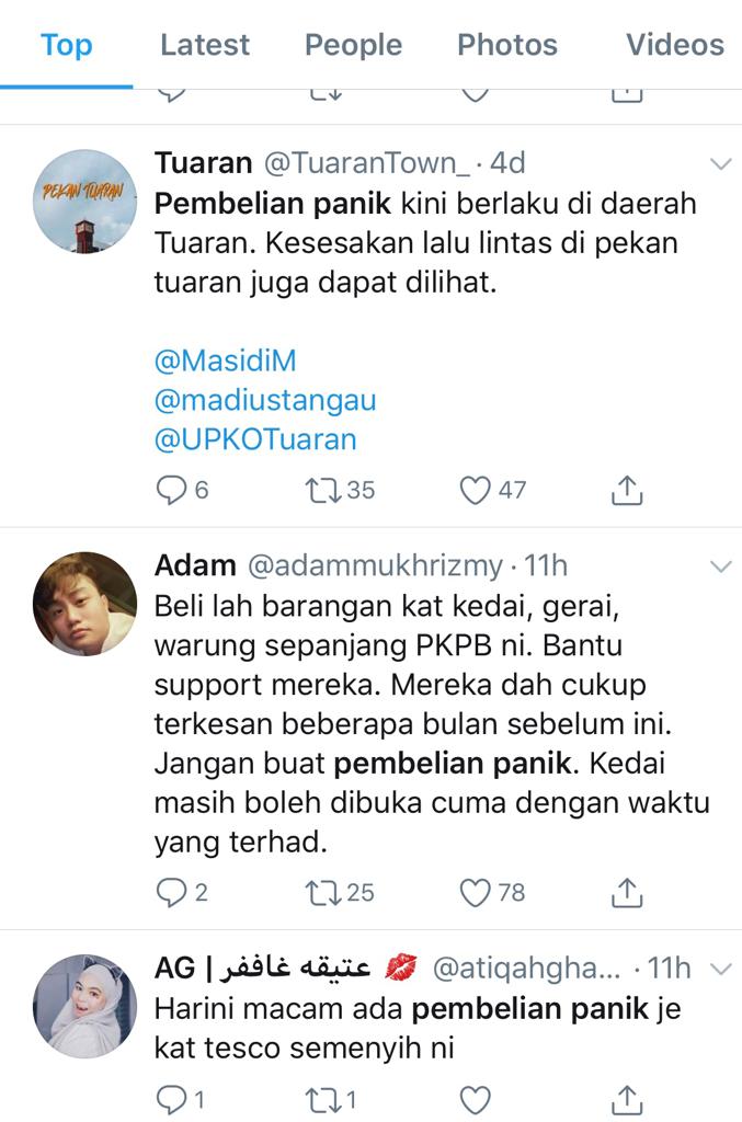 Seorang pengguna Twitter, @adammukhrizmy pula menyampaikan mesej buat seluruh rakyat Malaysia dengan membeli barangan buat membantu golongan yang terkesan, bukan mmebuat pembelian panik.