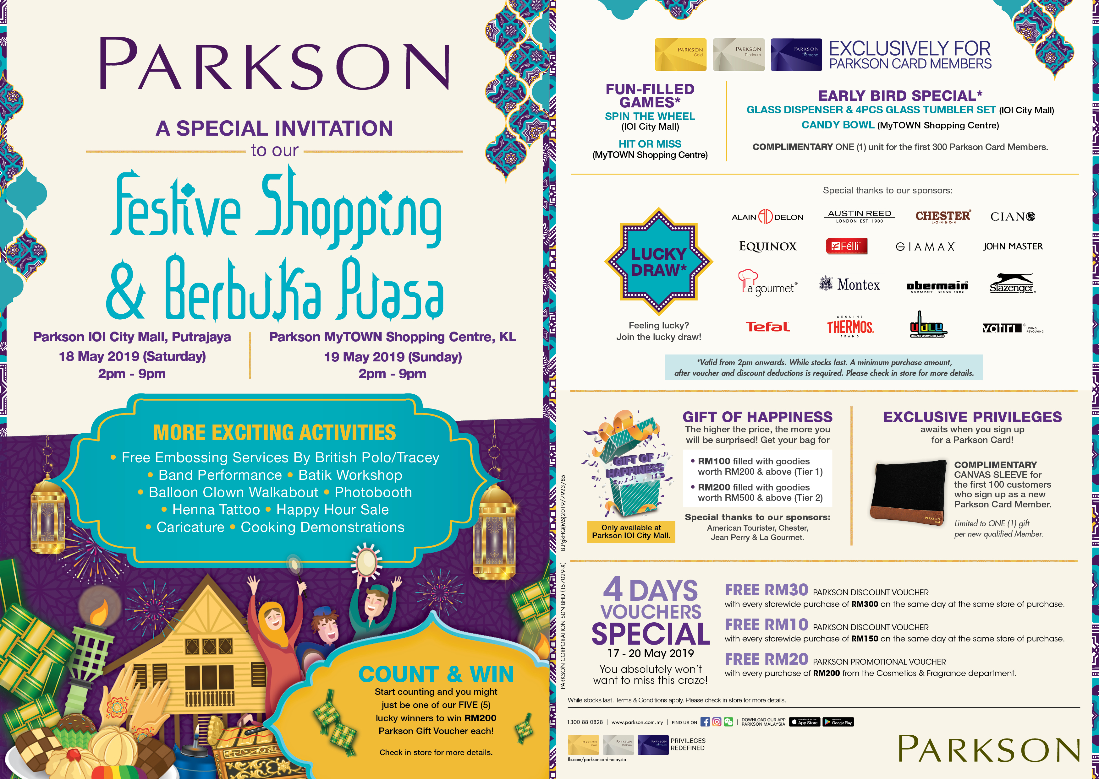 Festival membeli-belah dan berbuka puasa Parkson ini akan diadakan selama dua hari iaitu pada Sabtu (18 Mei) bertempat di Parkson IOI City Putrajaya, jam 2 hingga 9 malam.