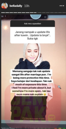 Menerusi perkongsian di Instagram Stories, Bella menjelaskan dia tidak mahu terlalu mendedahkan tentang kehidupannya bersama suami di media sosial.