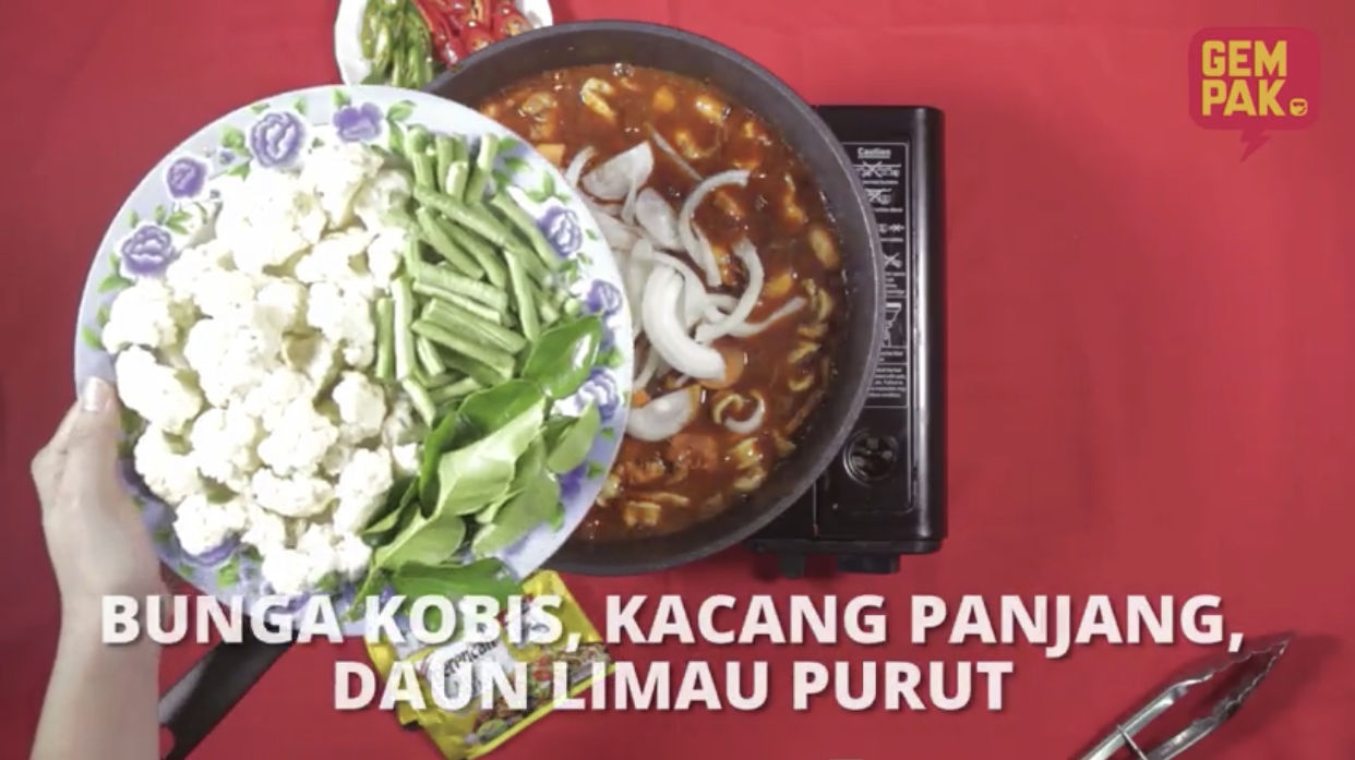 Masukkan sayur-sayur lain seperti bunga kobis dan kacang panjang, serta daun limau purut