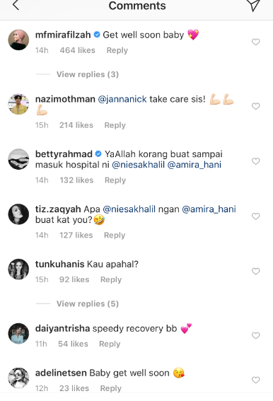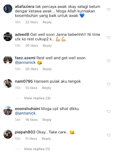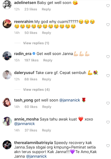 Rata-rata peminat serta rakan artis terkejut dan risau dengan keadaannya meninggalkan komen yang mendoakan supaya Janna kembali pulih selepas menerima rawatan.