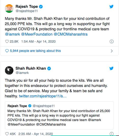 "Terima kasih banyak Shah Rukh Khan atas kebaikannya berkontribusi (menyediakan) 25.000 perlengkapan APD. Ini akan sangat membantu dalam mendukung perjuangan kita melawan Covid-19 dan melindungi garda terdepan tim medis @iamsrk @MeerFoundation @CMOMaharashtra."