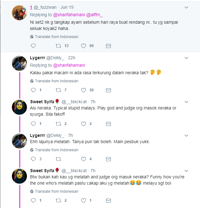 "Aku pakai baju kurung Kedah dan jeans kau yang rasa panas. Nenek gua tak sekejam nenek lu bro," tulisnya.