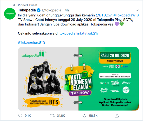 Perusahaan e-commerce, Tokopedia segera membawa grup BTS untuk tampil dalam program acara televisi Indonesia.