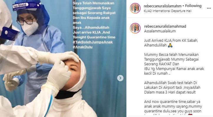 Pelakon Datin Rebecca Nur Al Islam menjalani ujian saringan COVID-19 selepas pulang dari Sabah.