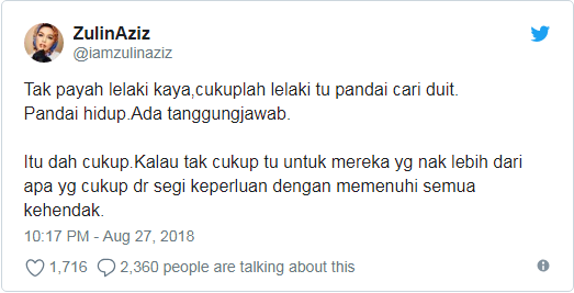 Menurut Zulin di laman Twitter, dia sebaliknya berpendapat bahawa seseorang lelaki itu harus pandai mencari duit dan bertanggungjawab dalam menjaga keluarga.