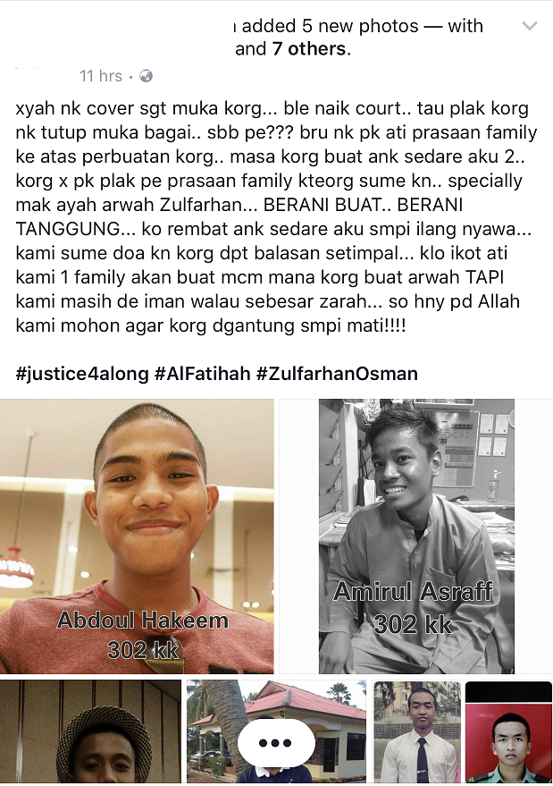 Entri itu juga turut disertakan dengan hashtag #justice4along #AlFatihah #ZulfarhanOsman.