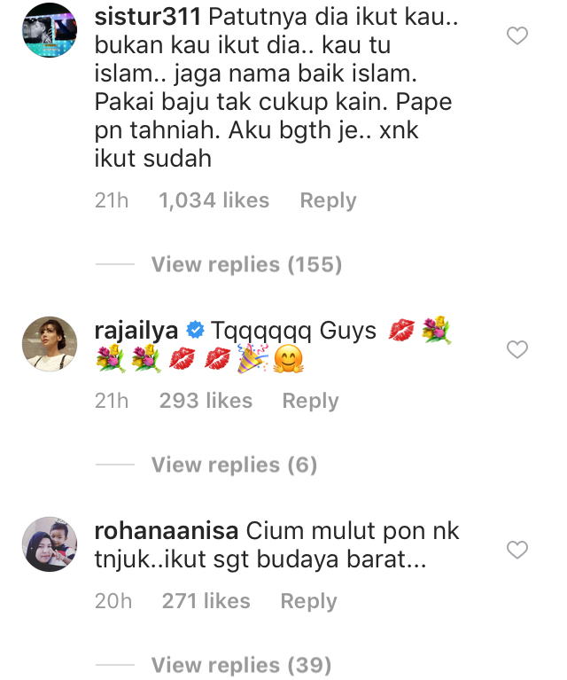 "Patutnya dia ikut kau, bukan kau ikut dia. Kau tu Islam, jaga nama baik Islam. Pakai baju tak cukup kain. Aku bagitahu je, tak nak ikut sudah," tulis salah seorang pengguna.