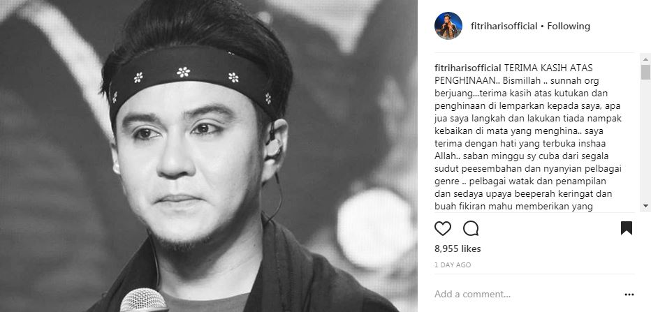 Kata Fitri menerusi sebuah entri di Instagram, dia menerima setiap kutukan dan penghinaan yang dilemparkan terhadapnya dengan hati terbuka.