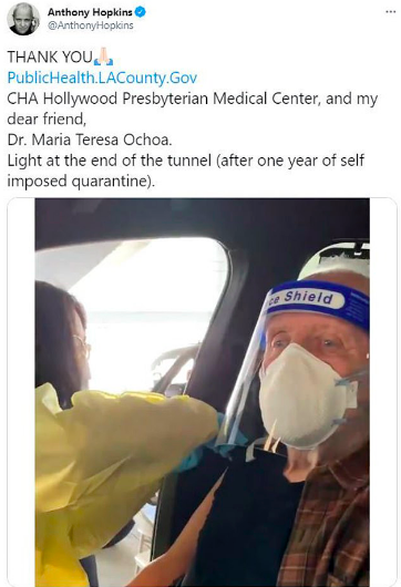 Dalam kemas kini di akaun Twitter, Hopkins yang berusia 83 tahun berkongsi video dan beberapa keping foto dirinya sewaktu menerima suntikan vaksin yang diambil dari dalam kenderaan secara pandu lalu.