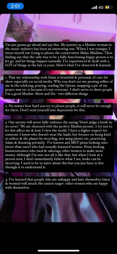 "Mengapa anda tidak pernah melihat saya memuat naik foto memakai telekung, solat atau membaca Al Quran adalah ia bukan untuk tontonan umum. Saya tidak perlu membuktikan diri sebagai seorang Muslim yang baik.