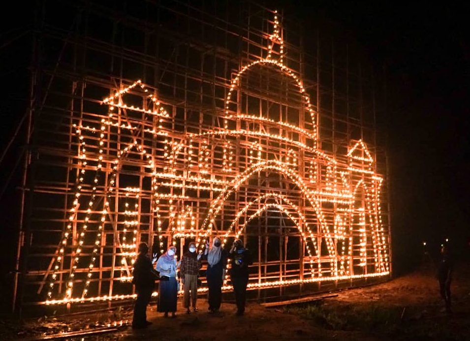 Tempoh tiga bulan diperuntukkan untuk mendirikan pelantar panjut gergasi berkenaan membabitkan empat tingkat dan hampir sepenuhnya dibina daripada buluh bagi menempatkan kira-kira 1,800 pelita tin jenis minyak tanah.