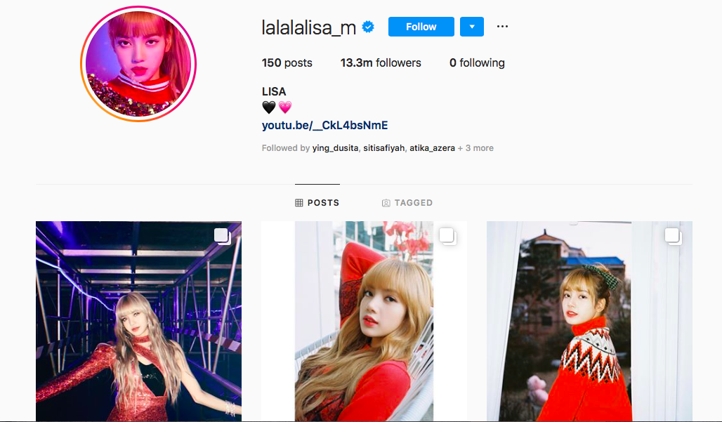 Pencapaian Lisa itu pun diperoleh hanya dalam tempoh lapan bulan selepas dia membuka akun personalnya dengan nama @lalalalisa_m pada Juni 2018.