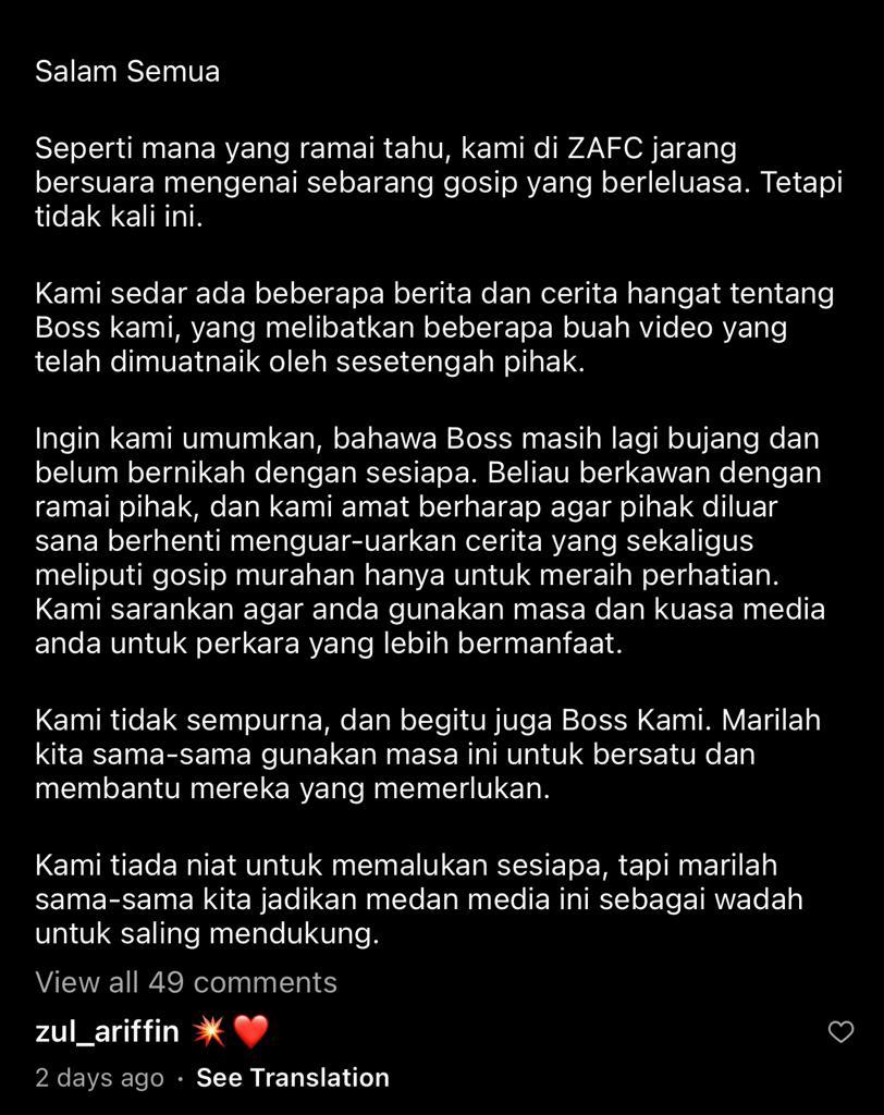 “Ingin kami umumkan bahawa Boss masih lagi bujang dan belum bernikah dengan sesiapa. Beliau berkawan dengan ramai pihak, dan kami amat berharap agar berhenti menguar-uarkan cerita yang sekaligus meliputi gosip murahan hanya untuk meraih perhatian,” antara yang ditulis ZAFC.
