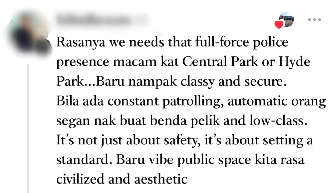 “I think we need a full-force police presence like in Central Park or Hyde Park. The area will be more secure. When there’s constant patrolling, those people will avoid doing anything illegal. It’s not just about safety, it’s about setting a standard. The vibe will only then become civilised and aesthetic.”