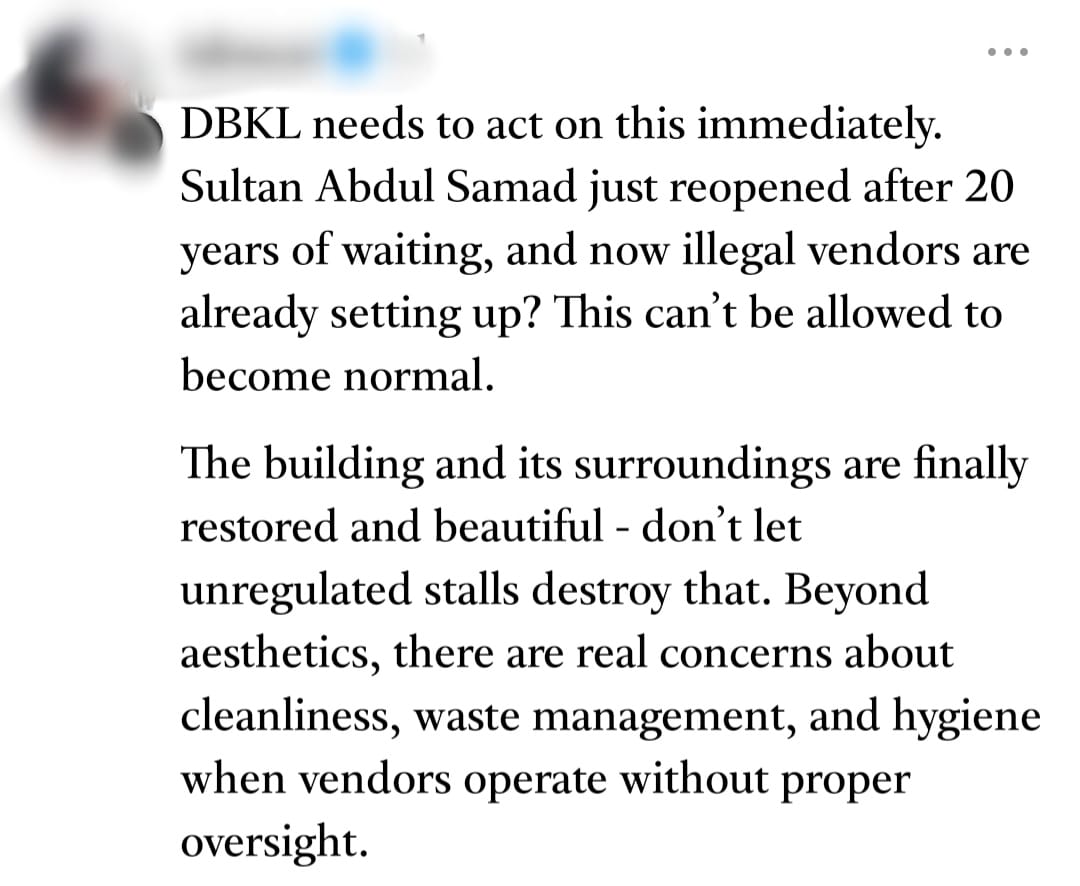 “How can there suddenly be a small bazaar at night in front of the Bangunan Sultan Abdul Samad? The building and the view are beautiful, but these vendors are tainting it. Don’t normalise this. DBKL should take action.”