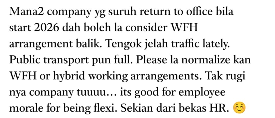 On Threads, a former HR practitioner called on companies to reinstate work‑from‑home (WFH) or hybrid arrangements, as traffic continues to worsen and public transportation has become increasingly crowded — making daily commuting exhausting for employees.